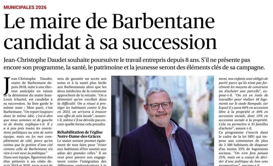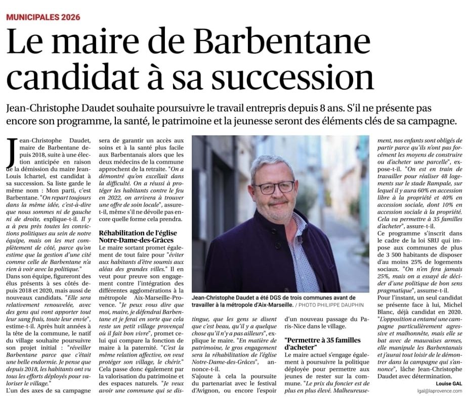La Provence consacre une pleine page à ma candidature à la mairie de Barbentane pour les élections municipales de mars 2026. Sous le titre « Le maire de Barbentane candidat à sa succession », l’article revient sur les huit années de travail déjà accomplies et présente les grandes priorités de la campagne : la santé, le patrimoine et la jeunesse.