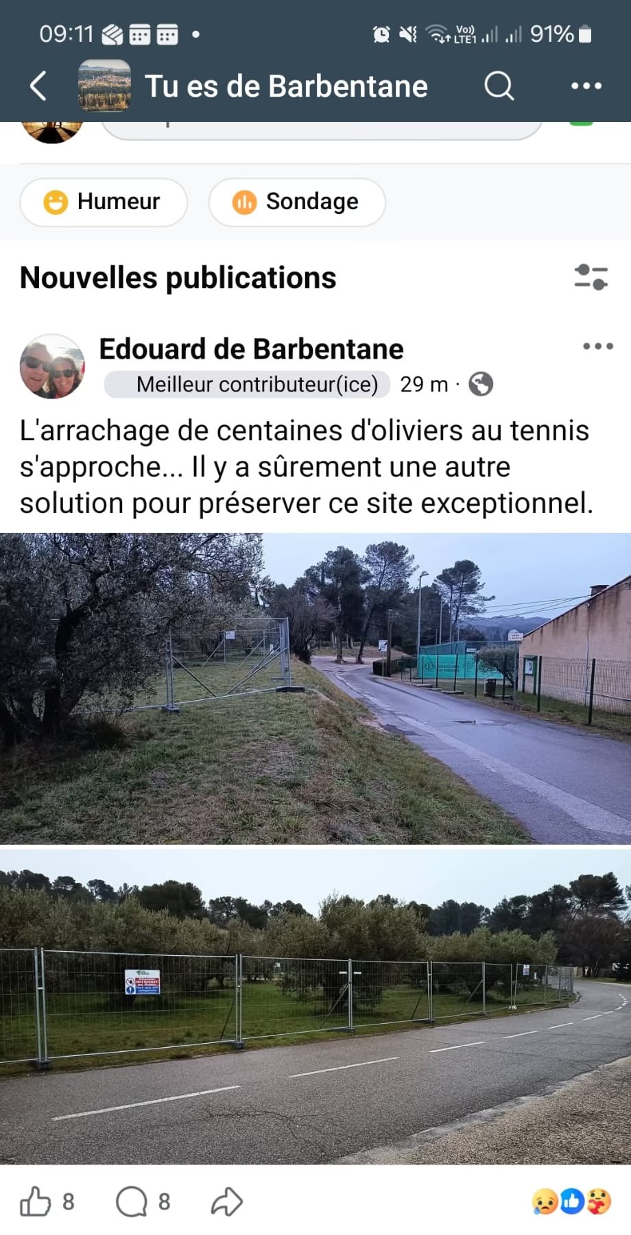 😡 Ce matin, un candidat officiel de la liste de Michel Blanc a négligemment posté sur le compte « Tu es de Barbentane » l’information suivante : « L’arrachage de centaines d’oliviers au tennis s’approche…Il y assurément une autre solution pour préserver ce site exceptionnel » et y a ajouté deux photos.