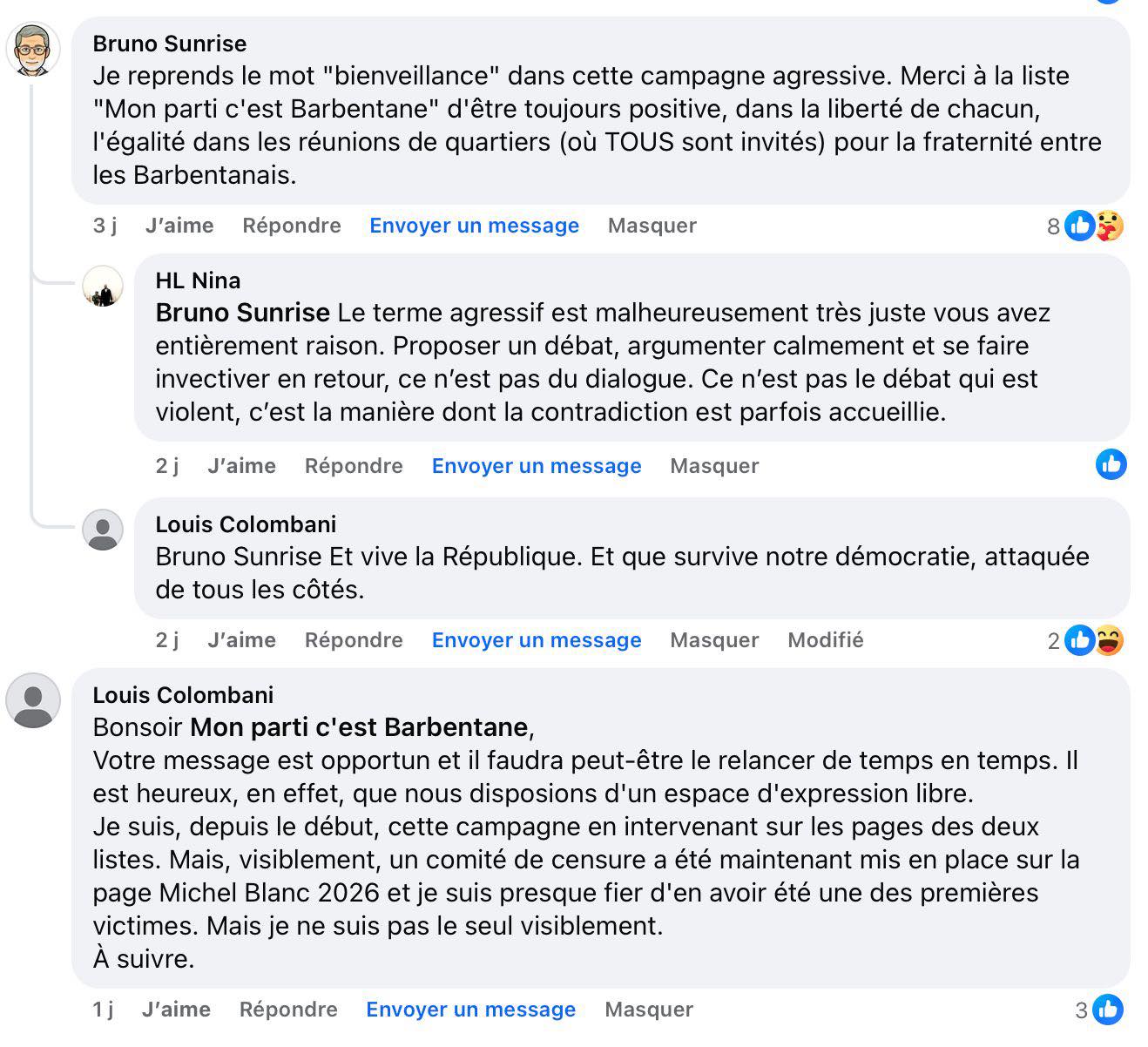 🔴 En premier lieu, c’est le refus total de M. Michel Blanc de débattre devant tous à la salle des fêtes.