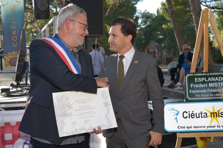 11 Oct. 2025 - Barbentane s’est vu décerner le label « Ciéuta Mistralenco » par le Capoulié du Félibrige, Paulin Reynard, en reconnaissance de son engagement en faveur de la langue, de la culture et des traditions de Provence. La cérémonie, marquée par la participation de nombreuses associations locales, a été ponctuée par le dévoilement de panneaux dédiés à l’esplanade Frédéri Mistral et à l’entrée de ville, la signature d’une charte, le chant de la Coupo Santo par les élèves de l’école des Moulins et un concert de Cortesia. Cette distinction consacre Barbentane comme terre de transmission et de fierté provençale.
