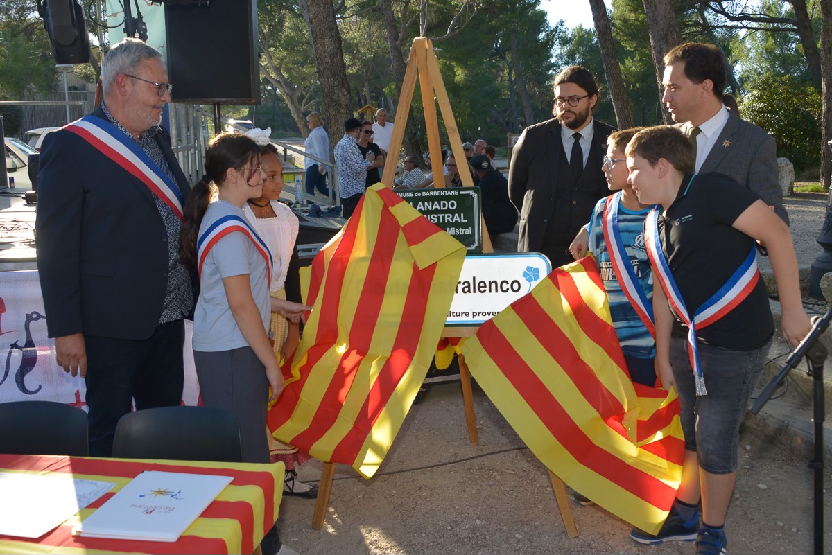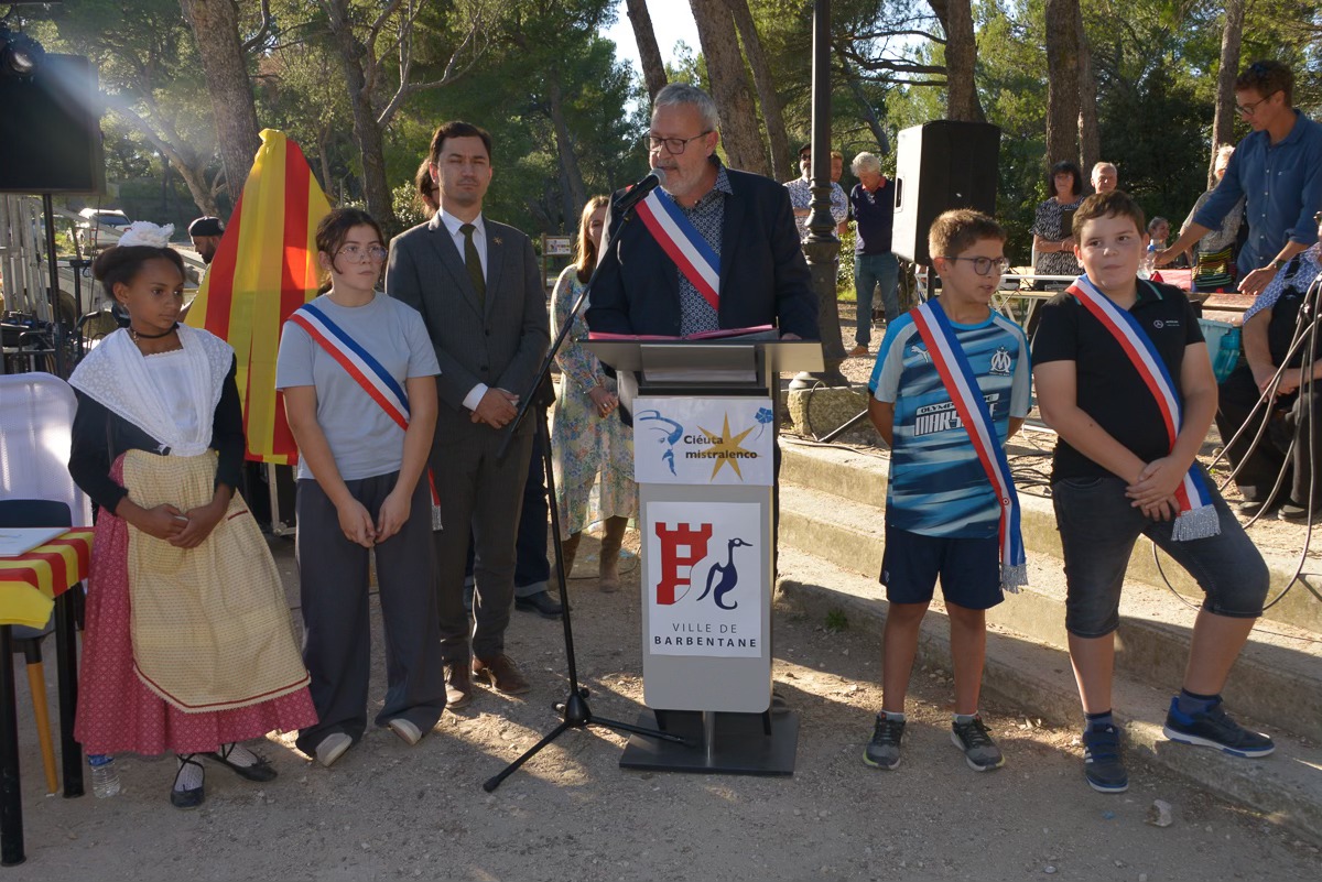 11 Oct. 2025 - Barbentane s’est vu décerner le label « Ciéuta Mistralenco » par le Capoulié du Félibrige, Paulin Reynard, en reconnaissance de son engagement en faveur de la langue, de la culture et des traditions de Provence. La cérémonie, marquée par la participation de nombreuses associations locales, a été ponctuée par le dévoilement de panneaux dédiés à l’esplanade Frédéri Mistral et à l’entrée de ville, la signature d’une charte, le chant de la Coupo Santo par les élèves de l’école des Moulins et un concert de Cortesia. Cette distinction consacre Barbentane comme terre de transmission et de fierté provençale.